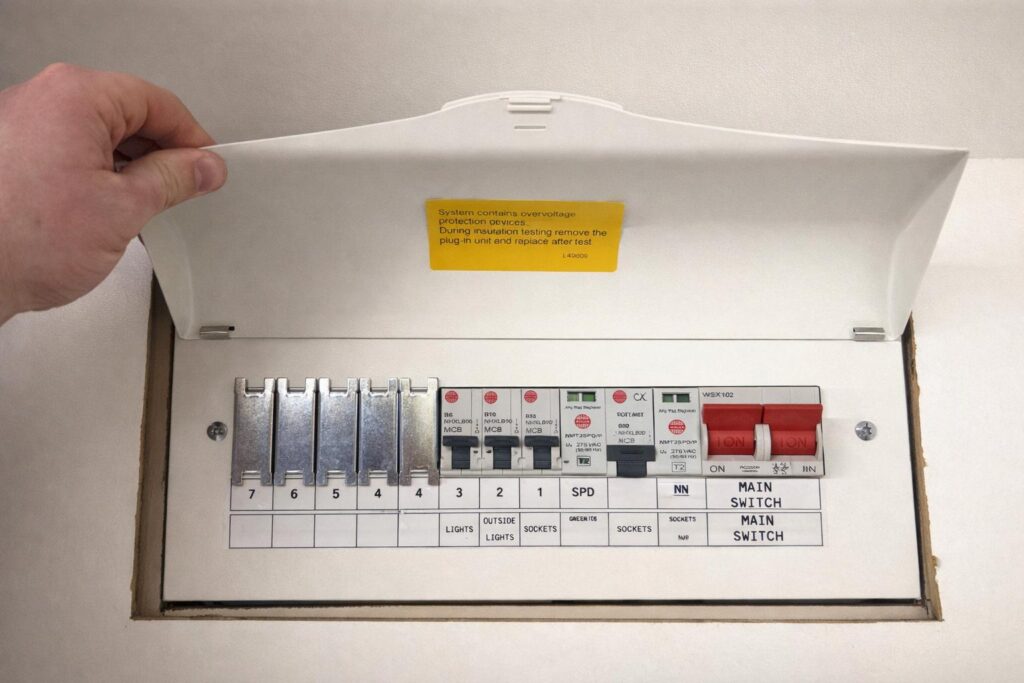 An outdated fuseboard isn’t just inconvenient — it’s a safety risk. We upgrade consumer units to modern RCD-protected boards, ensuring your home meets current UK wiring regulations (BS 7671). All work is certified and inspected.